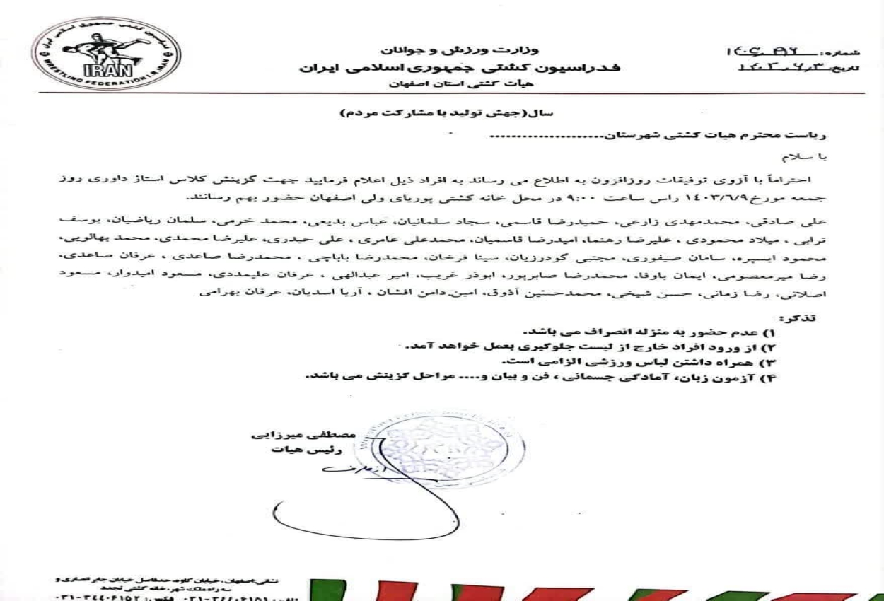 به گزارش روابط عمومی هیأت کُشتی استان اصفهان؛ اسامی افراد منتخب جهت گزینش کلاس استاژ داوری که در روز جمعه مورخ ۹ شهریور ماه خانه کشتی پوریای ولی ساعت ۹ برگزار میشود به شرح زیر است.