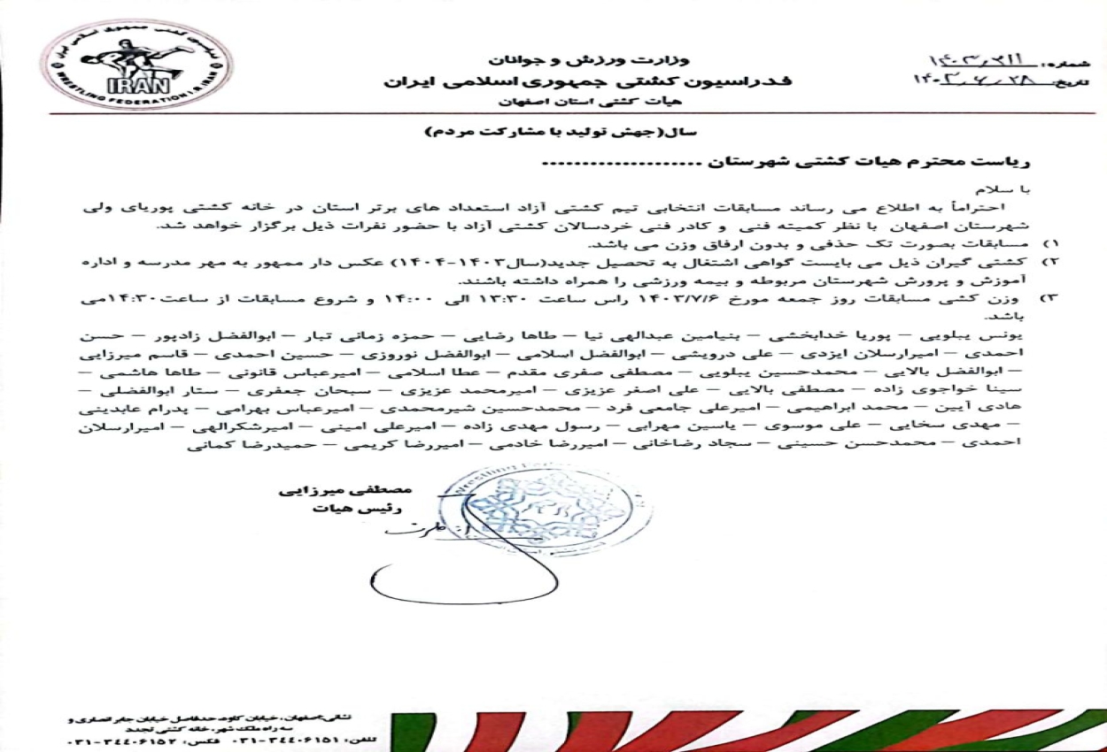مسابقات کشتی آزاد انتخابی استعدادهای برتر استان اصفهان جمعه ششم مهرماه ۱۴۰۳