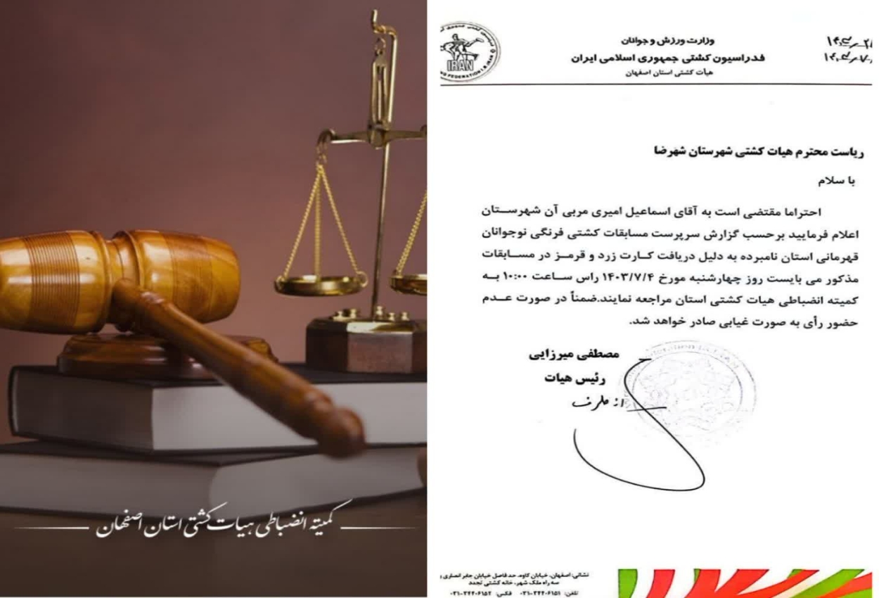 دعوت آقای اسماعیل امیری به کمیته انضباطی هیات کشتی استان اصفهان