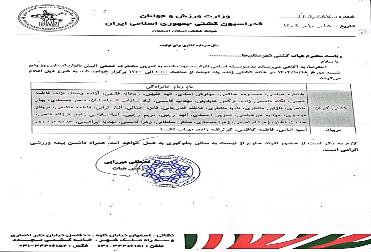 نفرات دعوت شده به اردو تیم منتخب کشتی آلیش بانوان استان اصفهان