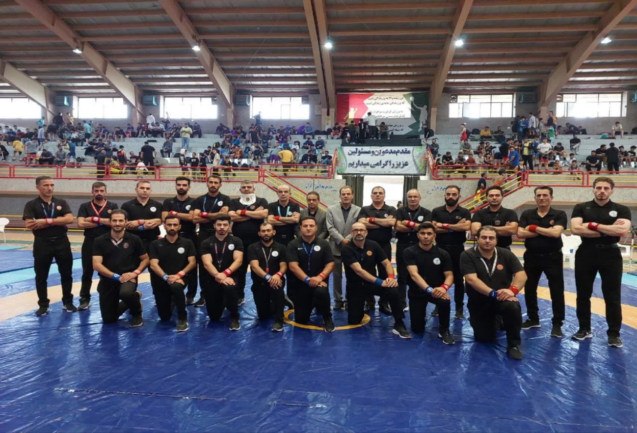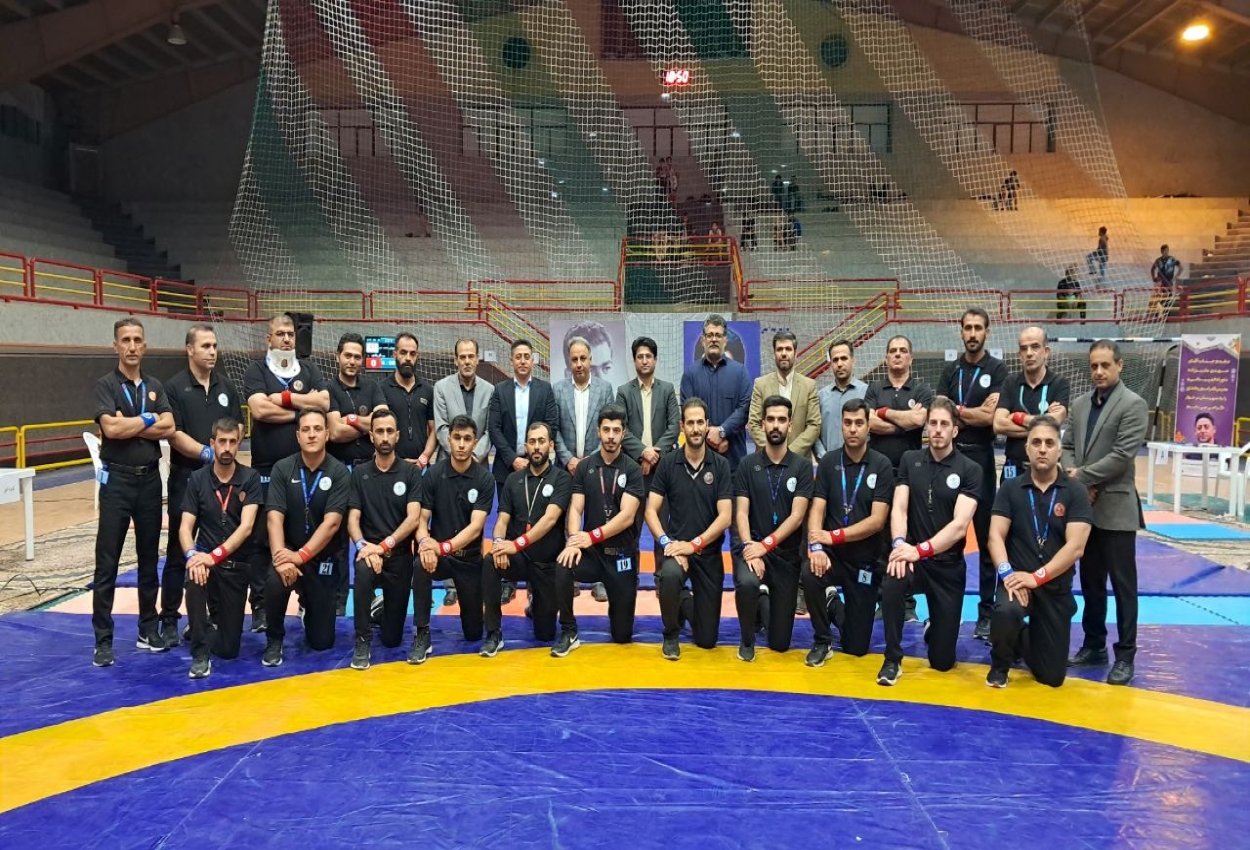 کادر اجرایی و داوران قضاوت کننده در مرحله آخر مسابقات لیگ کشتی آزاد نونهالان استان جام آینده سازان یادواره شهدای کشتیگیر جنگ دوازده روزه